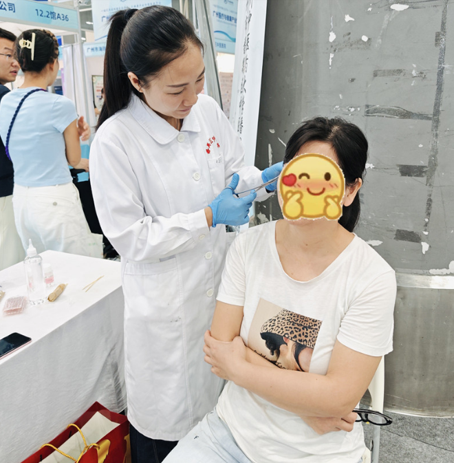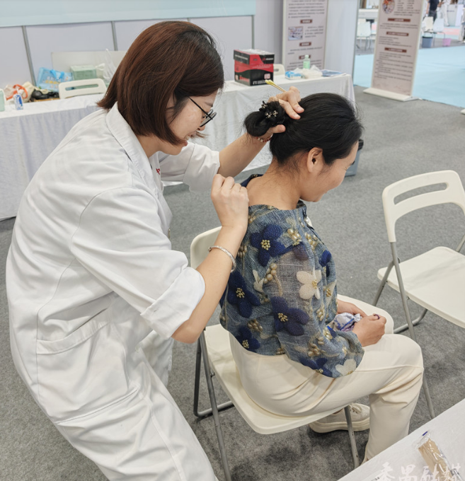 8月23日下午,第八届广州医博会现场,广州中医药大学番禺医院“中医体验互动区”前排起长队。刚步入职场的谢女士眉头微蹙、面露疲惫,在人群中格外显眼。妇科护士长李超云为她进行耳穴压豆治疗并耐心疏导,谢女士紧锁的眉头渐渐舒展。