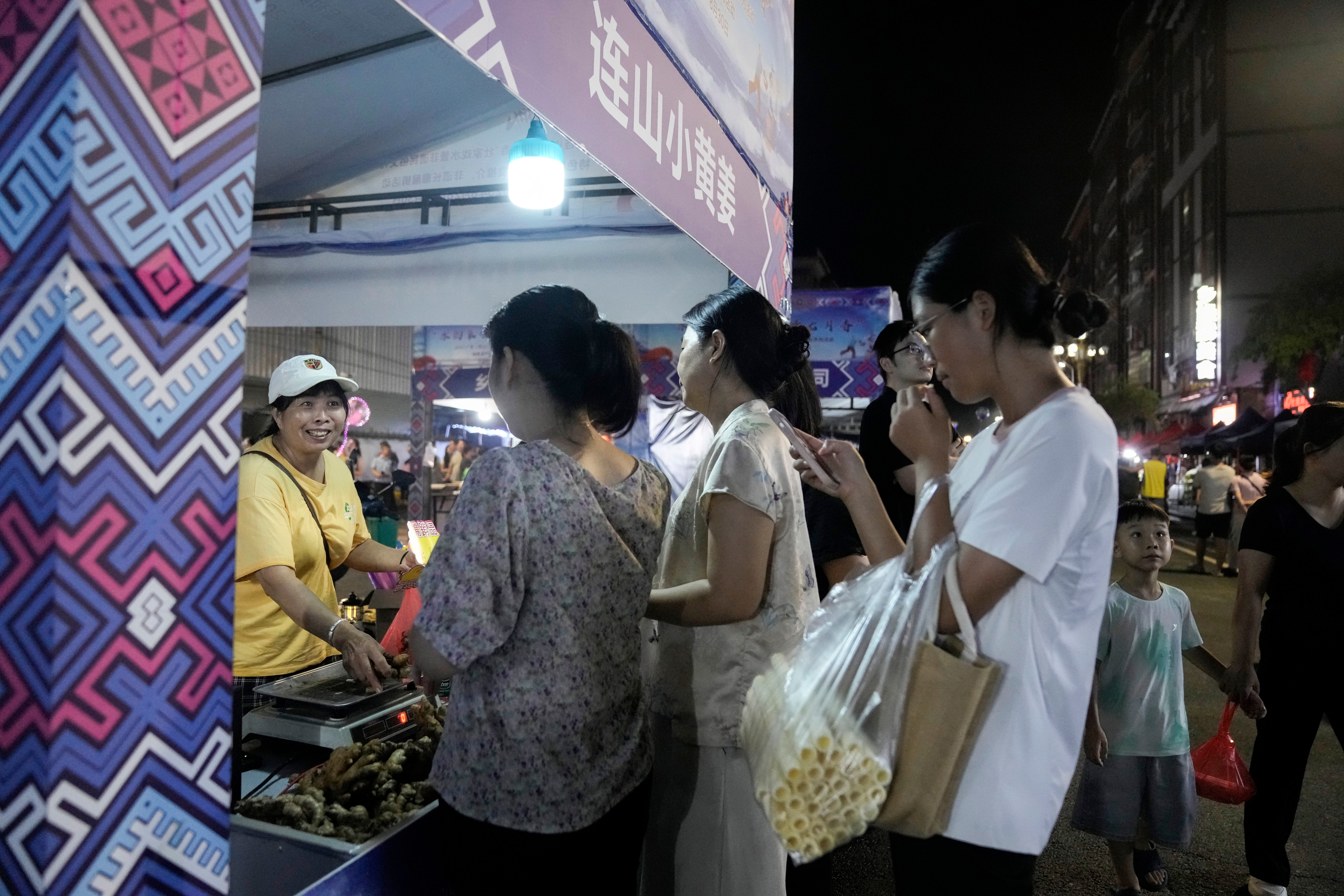 在连山县城吉水河的另一岸,长达千米的特色农产品和美食推介、非遗长廊展销活动区从白昼热闹到星夜,随着夜幕降临,现场人气也愈加旺盛。